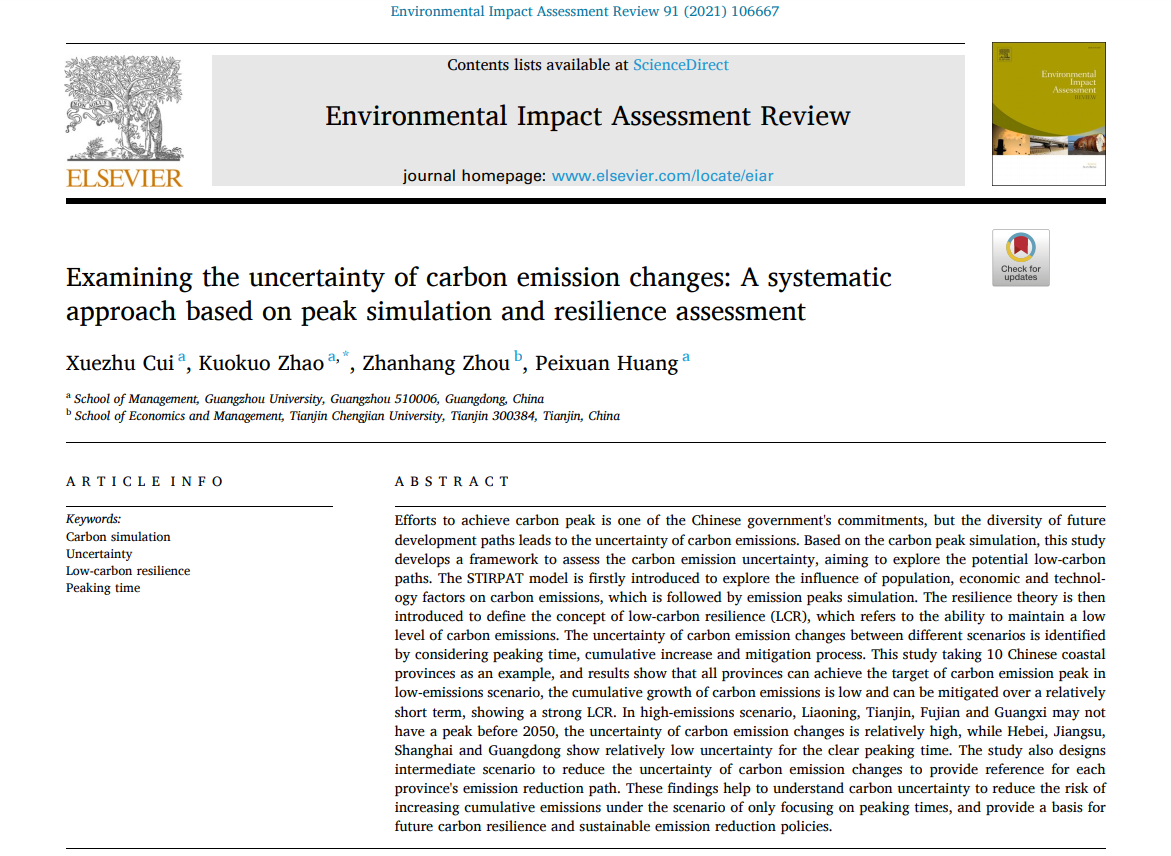 崔雪竹副教授以第一作者身份发表了题为“Examining the uncertainty of carbon emission changes: A systematic approach based on peak simulation and resilience assessment”(评估碳排放变化的不确定性:基于峰值模拟和弹性评估的系统方法)的研究成果。该论文发表于国际期刊《Environmental Impact Assessment Review》,该期刊为SSCI检索,最新影响因子为4.549,五年影响因子为5.08,在环境研究(ENVIRONMENTAL STUDIES)领域中排名第34/125,是JCR二区期刊。论文链接://doi.org/10.1016/j.eiar.2021.106667。论文通讯作者为彩票在线购买