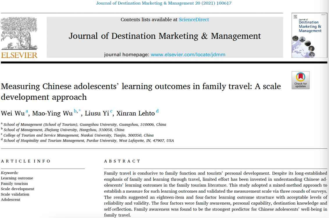 旅游与酒店管理系青年教师吴微博士作为第一作者在SSCI期刊《Journal of Destination Marketing & Management》发表论文“Measuring Chinese adolescents’ learning outcomes in family travel: A scale development approach”。该期刊为酒店、休闲、运动与旅游领域以及管理学领域的知名期刊(JCR一区,最新影响因子为6.952)。该研究受到国家自然科学基金项目(71804030)的资助。