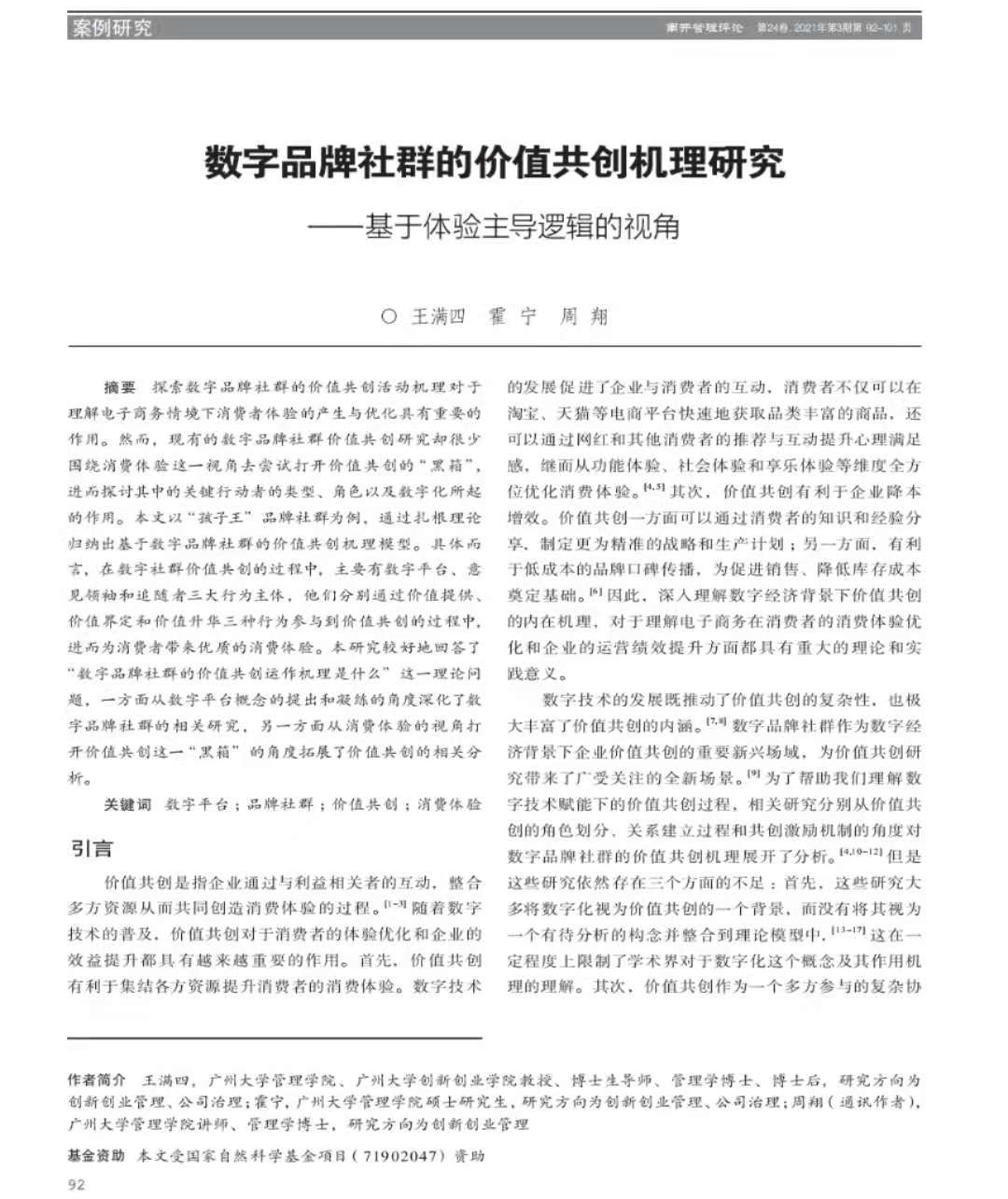 教师王满四教授为第一作者和周翔博士为通讯作者的论文《数字品牌社群的价值共创机理研究——基于体验主导逻辑的视角》在《南开管理评论》发表。本文第二作者为彩票在线购买