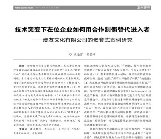 我学院皮圣雷副教授以第一作者在《南开管理评论》2021年第1期发表题为“技术突变下在位企业如何用合作制衡替代进入者——漫友文化有限公司的嵌套式案例研究”的学术论文。