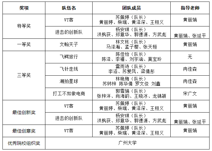 表1.三创赛广州大学队伍获奖情况