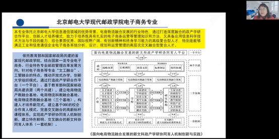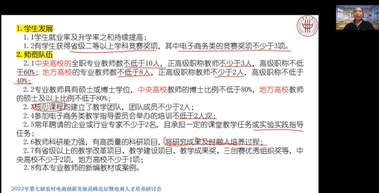 进行的中垌镇的项目表示了肯定,认为数字乡村和农村电商息息相关;姚卫新教授分享了一流专业认证标准,从课程体系和支持条件等五个方面为大家进行了详细解读;华迎教授从总体要求、专业特点和建设思路三个方面介绍了电子商务专业课程思政建设的重点内容;胡桃教授介绍了所在高校中国邮政与电子商务专业之间的联系与合作,并展示了系列成果;张润彤教授就电子商务专业发展提出紧扣一流专业进行对标和改进、借助优势发展长处等建议;倪明教授提到受疫情影响,学生就业困难和因为线上教学培养质量下降的问题,提出产教融合和科教融汇的解决方案;邓顺国教授结合党和国家的发展强调了农村电商发展的重要性。