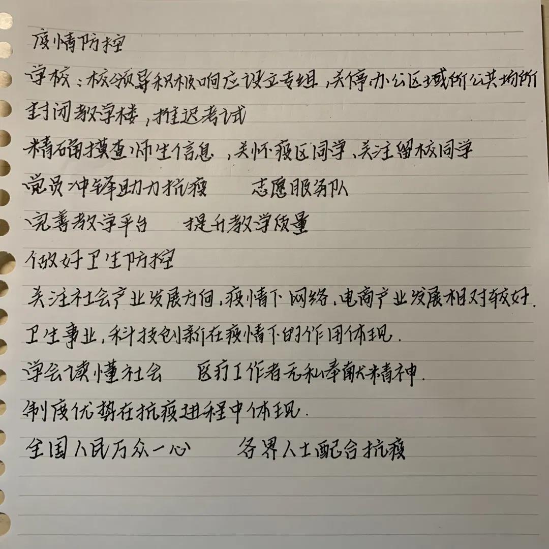 正如习近平总书记所说,这次的疫情是危机,也是大考。面对这场疫情,全国上下听从党的领导安排,各行各业的人都在默默付出,尤其是工作在一线的逆行者们。通过这次疫情我们也看到了中国的发展,中国是一个有实力、有担当的国家,对内组织有序,对外积极友好。我们作为新时代的青年要努力奋进,为祖国展现出最好的模样。