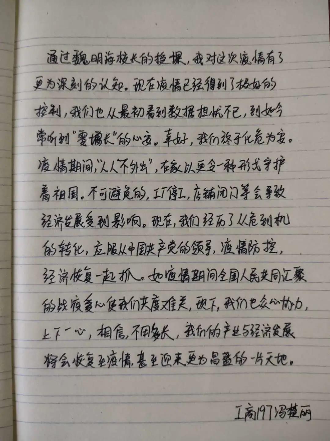 今天很荣幸有机会能够聆听魏明海校长的思政课,让我受益匪浅!魏校长以此次爆发的新冠性肺炎为切入点,从国家,社会再到个人,层层深入进行剖析。面对这场危机,全国人民万众一心,全民动员,全面参与,全面配合,共抗疫情!我们有党组织这一坚强的后盾,有奋战在一线的医护人员,科学技术的保驾护航,等等,我们一定可以顺利度过这次难关。而作为一名学生,我们应该承担作为社会一份子的责任,做好力所能及的事情,配合好防疫抗炎工作!