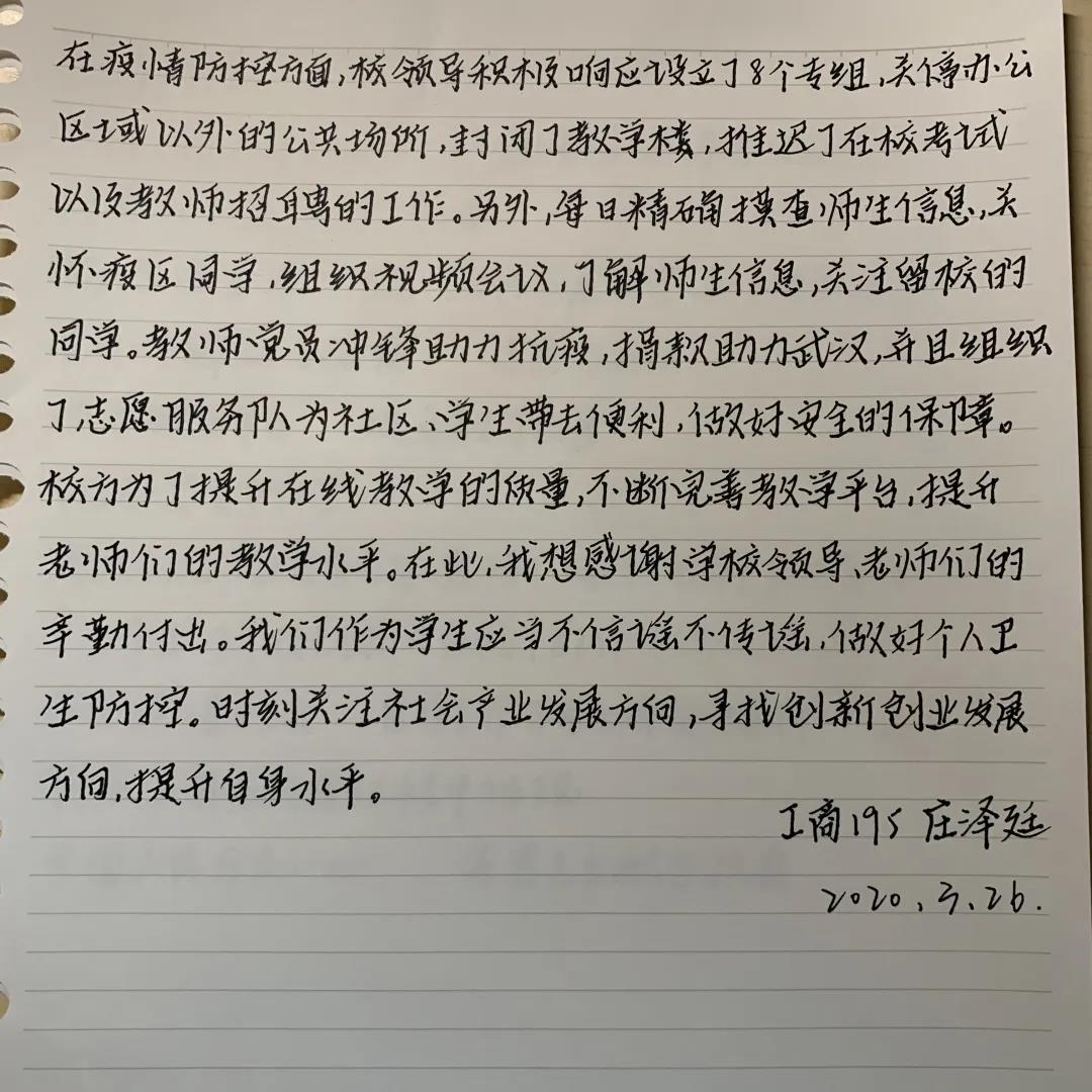 疫情阻碍我们线下上课的可能,对我们的生活与学习都带来了一定的影响,但更应该在这堂实践大课中自我完善,要利用好这段居家时间,开展好在线学习,学会自我学习,做到自律,不断地充实自我。
